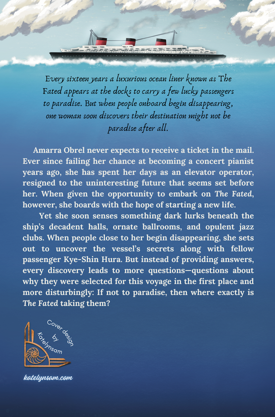 Amarra Obrel never expects to receive a ticket in the mail. Ever since failing her chance at becoming a concert pianist years ago, she has spent her days as an elevator operator, resigned to the uninteresting future that seems set before her. When given the opportunity to embark on The Fated, however, she boards with the hope of starting a new life. Yet she soon senses something dark lurks beneath the ship’s decadent halls, ornate ballrooms, and opulent jazz clubs. When people close to her begin disappearing, she sets out to uncover the vessel’s secrets along with fellow passenger Kye-Shin Hura. But instead of providing answers, every discovery leads to more questions—questions about why they were selected for this voyage in the first place and more disturbingly: If not to paradise, then where exactly is The Fated taking them?